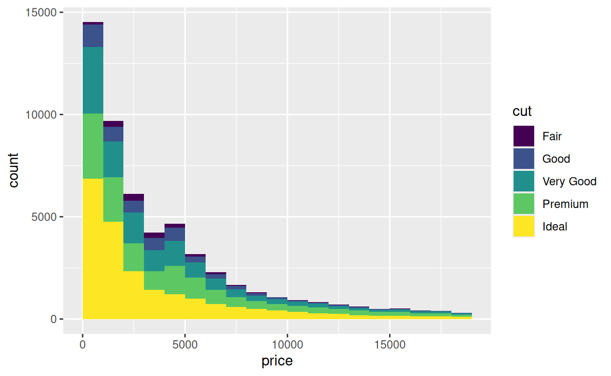 En ajoutant une couleur (avec fill) dans l’histogramme ci-dessous, nous avons divisé les données en cinq “sous-distributions” : la distribution du prix pour les diamants fair cut, pour les diamants good cut, very good cut, premium cut et ideal cut.
