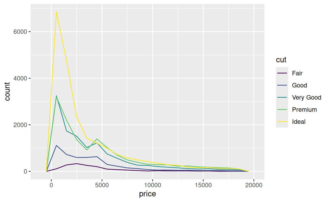 Utilisez un polygone de fréquences pour recréer le graphique de price et cut. Etant donné que les lignes n’ont pas d’intérieur comme les barres, vous allez utiliser le paramètre esthétique color plutôt que fill.