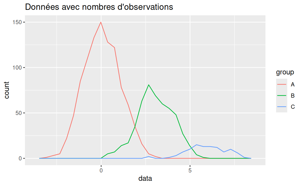 Les courbes de densité ne représentent pas un nombre d’observations sur l’axe des \(y\) mais la densité. La densité est analogue au nombre d’observations en un point divisé par le nombre d’observations total. Les densités aident à comparer les distributions des sous-groupes. Lorsque vous représentez plusieurs sous-groupes, chaque courbe de densité va contenir la même aire sous la courbe.